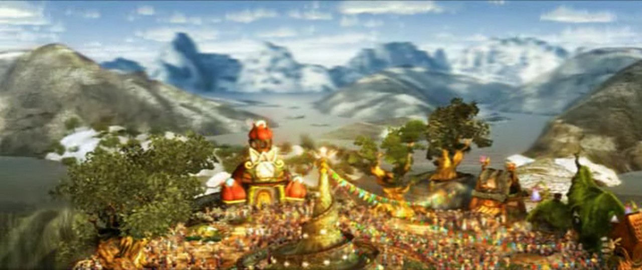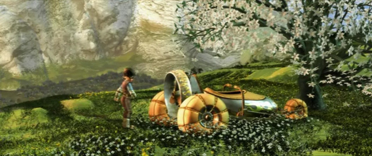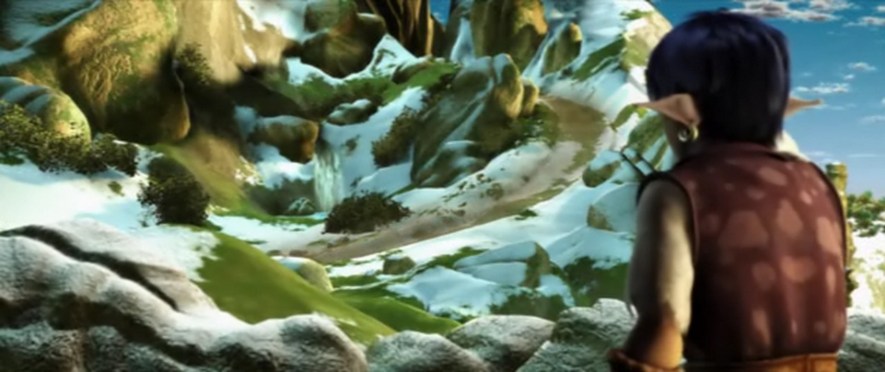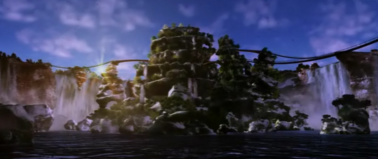 Der mächtige Felsen mit dem Zentrum Gayas, wo auch Bürgermeister Gayvan seinen Sitz hat. Man kommt nur über die Brücken auf den Felsen, die von den Seiten her auf die andere Seite führen – es sei denn natürlich, man hat eine Flugmaschine, so wie Boo und Zino.